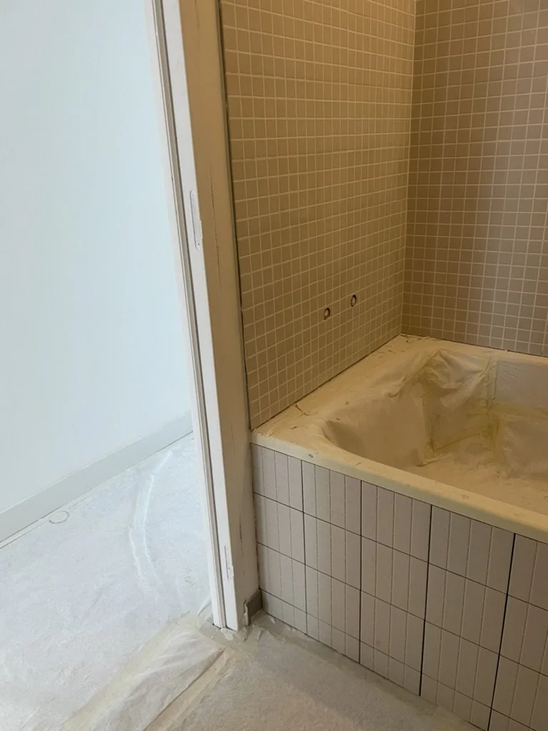 Un exemple de tablier carrelé dans l’appartement Aligre en cours de chantier (les joints n’ont pas été réalisés). Nous avons jouer sur deux références d’une même collection au niveau du mur et du tablier pour créer du rythme